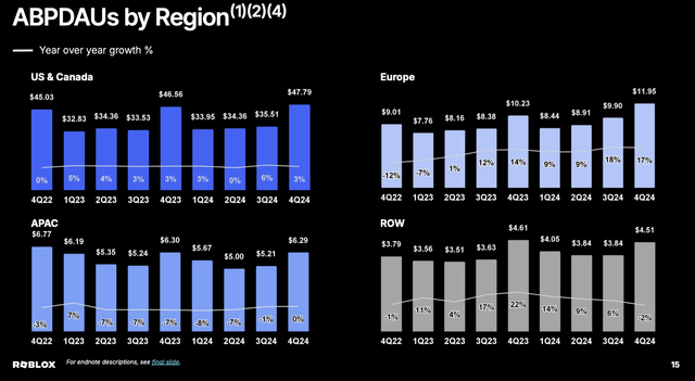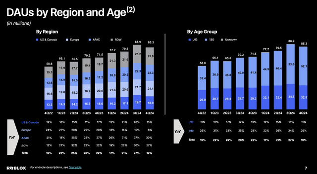 当然,所有这些收入来源的关键增长动力是 Roblox 用户群的增长。而这正是我最担心的问题:自 2023 年第二季度以来的七个季度里,Roblox 的 DAU(每日活跃用户数)一直在增长——直到最近一个季度,也就是第四季度,该公司的 DAU 环比减少了约 300 万,降至 8530 万。