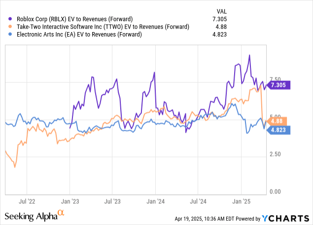 与此同时,Roblox 第一季度预订量预期为 11.25 亿至 11.50 亿美元,这意味着环比下降幅度将更大,为 16% 至 17%。在宏观经济形势恶化的时期,尤其是第一季度(并持续到第二季度)股市波动的情况下,我们可能会看到家长们为了孩子关闭游戏,导致第一季度及以后的预订量下降。认为 2025 财年季节性因素会比去年好的想法是错误的。