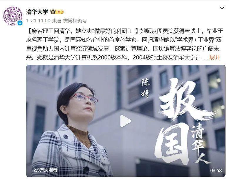 1月21日,清华大学微博账号发布视频介绍陈婧。